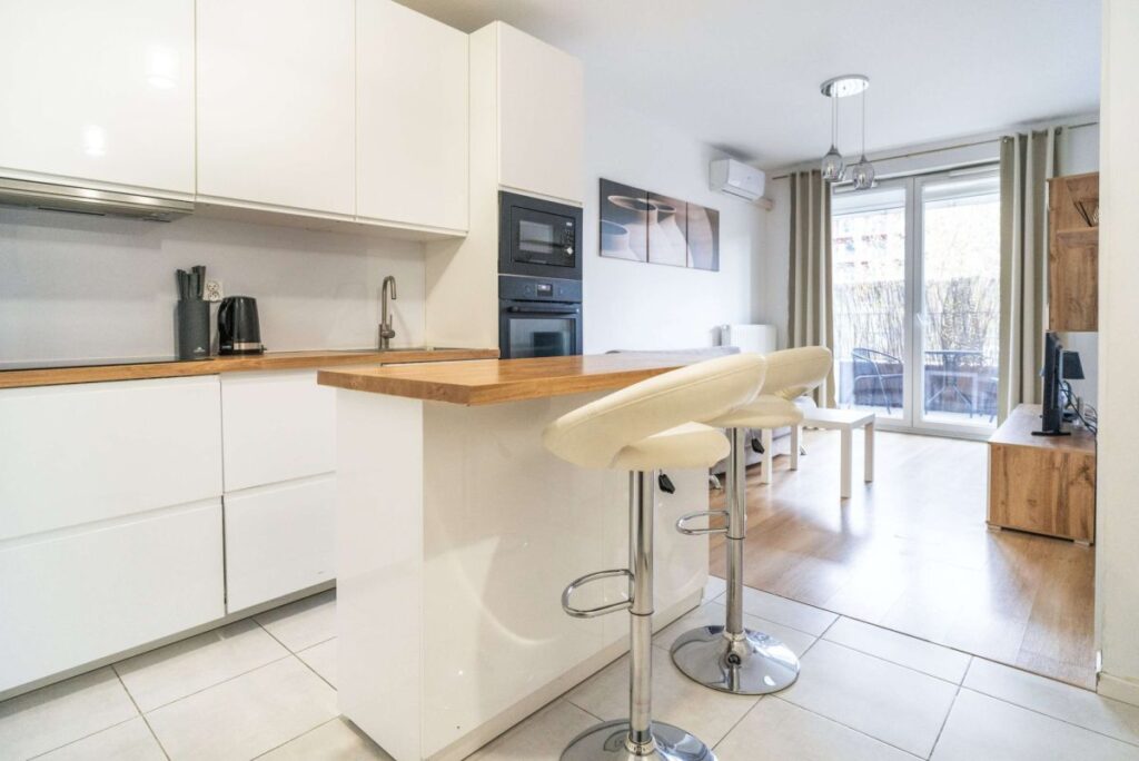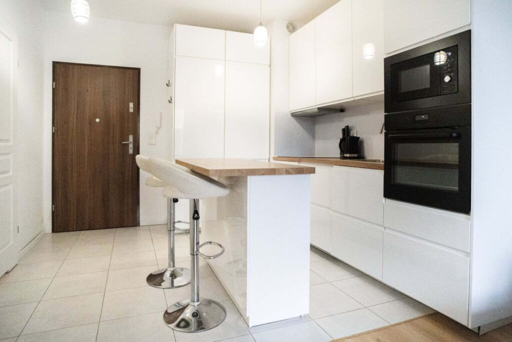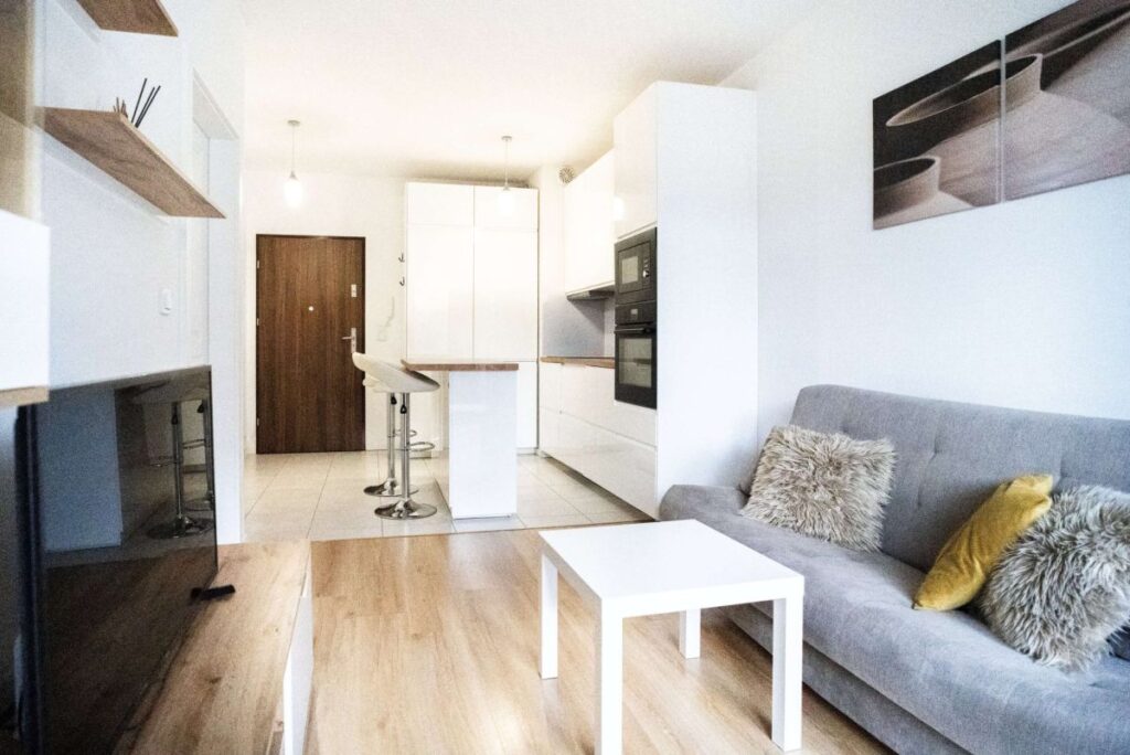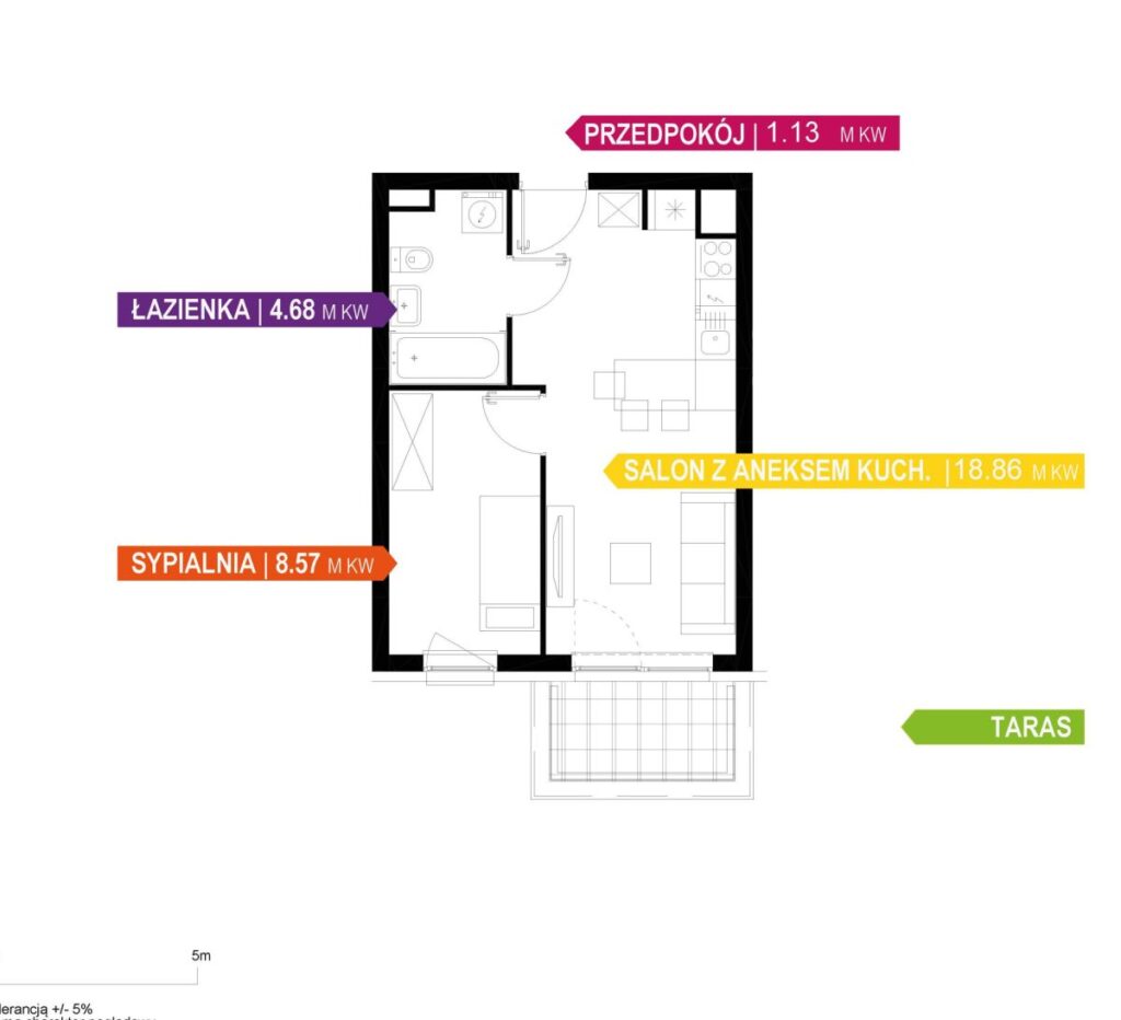 pokoju z aneksem kuchennym oraz wyjściem na balkon o wielkości ok 4,5 m2,